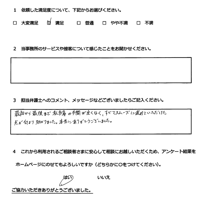 「最初から最後まで私自身の手間が全くなく、すべてスムーズに進めていただけた点が何より助かりました。本当にありがとうございました。」
