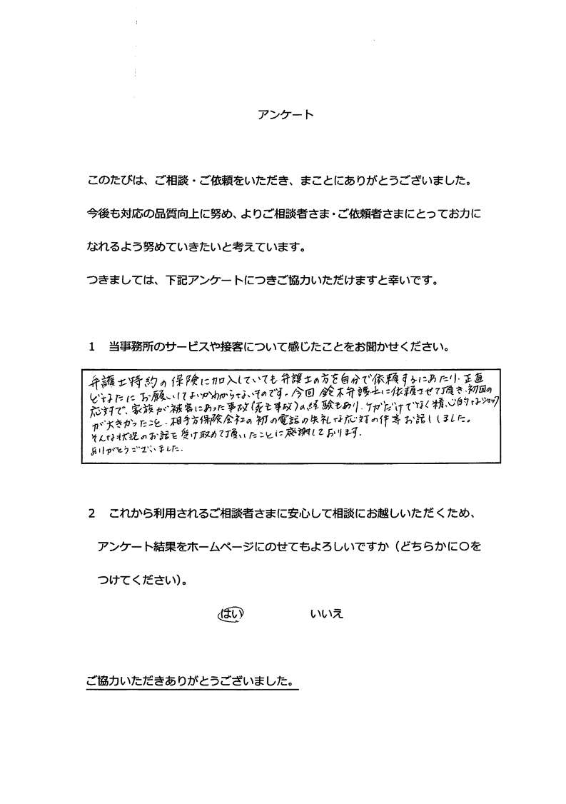 「弁護士特約の保険に加入していても、弁護士の方を自分で依頼するにあたり、正直どなたにお願いして良いかわからないものです。今回、鈴木弁護士に依頼させていただき、初回の応対で、家族が被害に遭った事故(死亡事故)の経験もあり、怪我だけでなく、精神的なショックが大きかったこと、相手方保険会社の初の電話の失礼な応対の件などお話ししました。そんな状況のお話を受け止めていただいたことに感謝しております。ありがとうございました。」